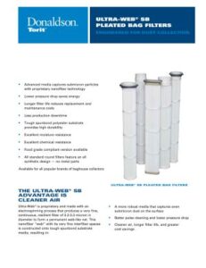 For more than two decades, Donaldson Torit has advanced the proven Ultra-Web fine fibre technology. Ultra-Web provides a very fine, continuous fibre of 0.2-0.3 micron in diameter to form a web-like net that traps dust on the surface of the media. Combining Ultra-Web technology with a sturdy spunbond polyester substrate, Ultra-Web SB pleated bag filters provide longer life, reduced downtime and reduced emissions.