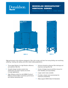 Donaldson Torit® Modular MediaFilter™ Vertical mist collector systems collect and filter mist, smoke, dust, fumes, vapors and odors from applications such as grinding, wet machining, rubber machining, die casting, wet grinding or soldering. The Modular MediaFilter Vertical mist collector system offers a variety of design layouts and mist filter choices for both flexibility and expandability.